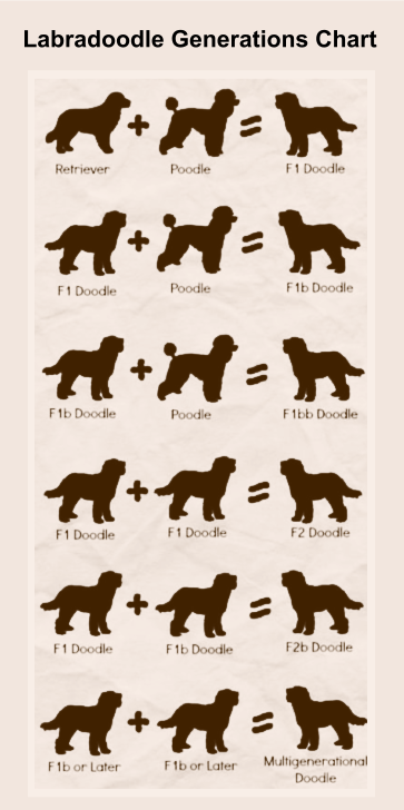 In America, the Labradoodle is a mix of just 2 breeds; Labrador Retriever and Poodle. The first pairing is considered the first generation (F1) and oftentimes has a hair coat that is more straight and sometimes slightly wavy and tends to shed very slightly. The next generation is often a first generation bred back to a Poodle to achieve the beautiful fleece coat that is the most desirable and does not shed and is the most allergy friendly. This generation is called an F1b. Lalou Labradoodles specializes in F1b and multi generation Labradoodles.